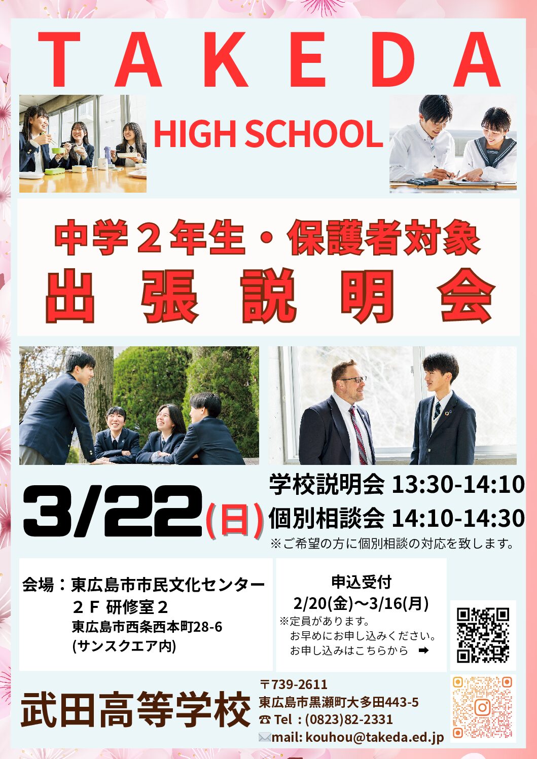 中学校2年生対象 出張説明会 投稿日:2025年2月13日 更新日:2026年2月20日 実施日 :2026年03月22日 実施時間:13:30~ 中学校2年生の生徒・保護者を対象に、学校説明会を開催します。次年度の志望校選択に備え、ぜひ本校の取り組みや実績を知っていただけたらと思います。会場は東広島市市民文化センター(サンスクエア)研修室です。申込み受付は2月20日(金)17:00~を予定しています。 お申込開始は、2月20日(金)17時です。