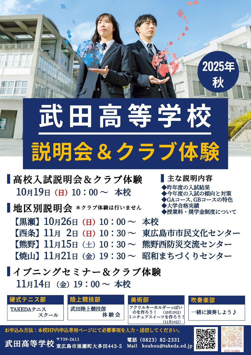 秋の説明会 投稿日:2024年8月31日 更新日:2025年9月22日 実施日 :2025年10月19日 実施時間:10:00~ 秋の学校説明会・入試説明会を、各地区会場や本校にて開催します。 本校で行う入試説明会やイブニングセミナーでは、ミニクラブ体験も行います。 多くの皆様のご参加をお待ちしています! *実施日時が10月19日 10:00~になっていますが、他にも別日程で開催するものがあります。 案内画像をご確認ください。 *各説明会で受付開始日が異なります。このページから申し込み専用ページに飛ぶようになりますので、受付開始日までお待ちください。