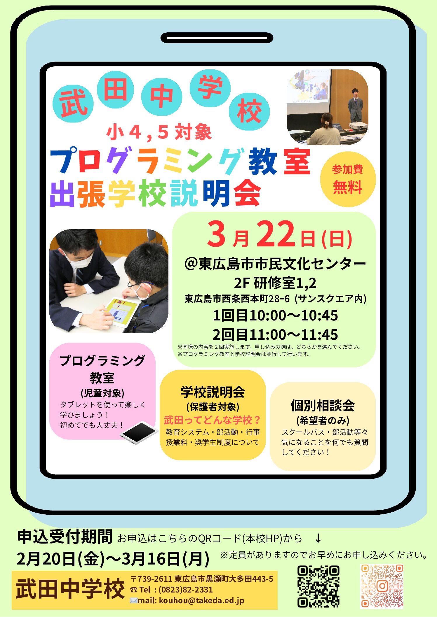 2025年度プログラミング教室&出張説明会 投稿日:2023年2月2日 更新日:2026年2月20日 実施日 :2026年03月22日 実施時間:①10:00~ ②11:00~ 小学4年生・5年生を対象としたプログラミング教室です。並行して、保護者の方向けの学校説明会・個別相談会も実施します。会場は東広島市市民文化センター(サンスクエア内)です。申し込み受付は2月20日(金)17:00~を予定しています。 お申込開始は、2月20日(金)17時です。