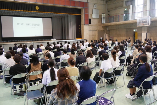 説明会では、武田高校の特徴や取り組み、新しくなるGAコース、GBコースのお話をさせていただきました。また、昨年度の入試結果と今年度の入試について、そして各教科からのワンポイントアドバイス(今年度は例年以上に詳しくお伝えしました!)も。皆さん、スマホでバッチリ写真におさめておられました。