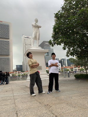 続いてはマーライオン公園、ラッフルズ上陸ポイントへ。天気にも恵まれ、クラス写真も撮ることができました。ラッフルズ像では定番のポーズ写真で決める生徒も。またシンガポールでは超高層ビルが多いのですが、なんと日本人が設計したものもあり、その中には広島の平和記念資料館を設計された方が、携わっているビルもあるとのことでした。