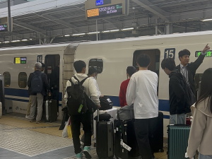 帰りの新幹線は12:02発。事前情報では乗り換え時間が2分しかない、修学旅行を締めくくるに相応しい、学年の力が試される難関でした。「緊張感持っていこう!」「列の先頭だけ乗れるパターンは流石に笑えない」などの声も飛び交います。