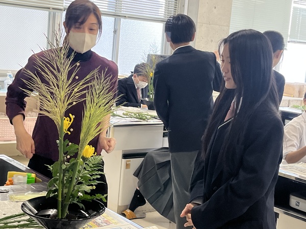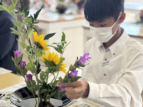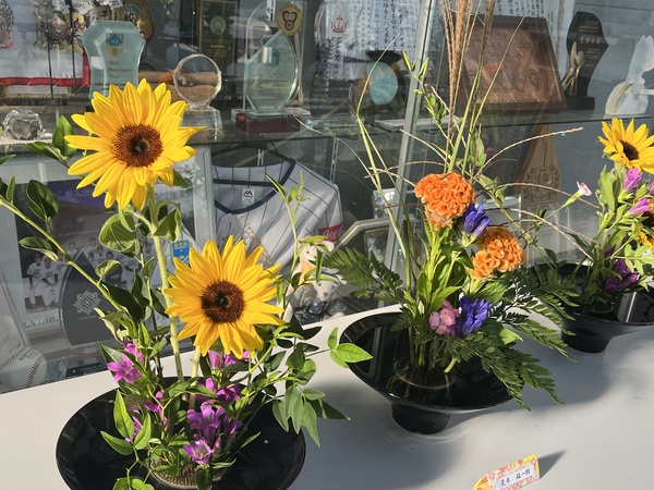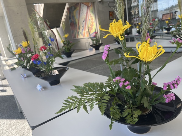 7日の授業では、10月とはいえまだ暑さが残り、花材には夏の花である向日葵と、秋を感じさせるススキが使われました。季節が夏から秋へと移りゆく様子を感じさせる生け花ができあがりました。