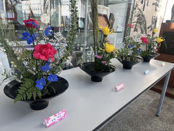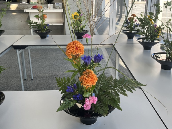 一方、28日の授業では季節が一気に進み、秋の涼しさを感じる作品となりました。糸菊は日に日に花を開き、黄色の鮮やかさを増しています。濃いピンクのカーネーションとまわりに散らしたデルフィニウムの青い色合いは、先日閉幕した大阪関西万博を思わせる華やかな生け花となりました。