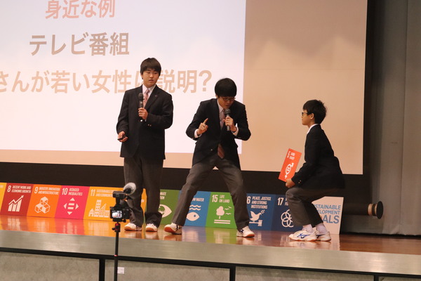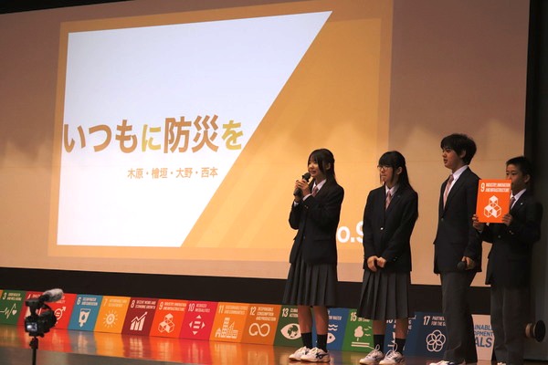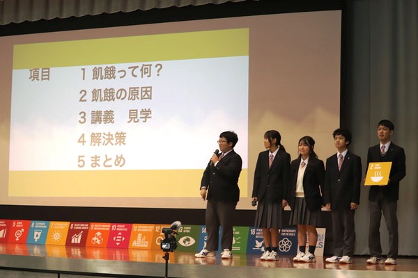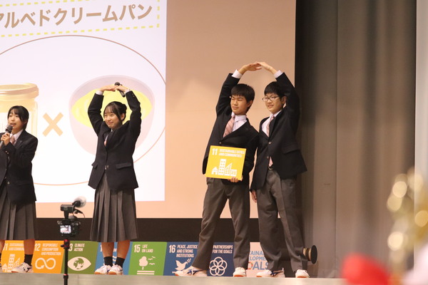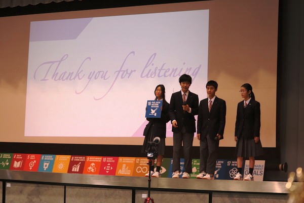 SDGs発表会は、予選で選ばれた6つのチームによる発表会です。生徒たちは、それぞれの課題意識をもとに調べ学習を行い、社会見学やSDGsに関わるお仕事をされている講師の方を招いての講演会等を通して学んだことをプレゼン資料にまとめて発表します。地元の企業を訪問したり、商品開発(!)を行っている班もありその深い思考と積極性には目を見張るものがありました。また、発表時のパフォーマンスも様々な工夫が見られ、楽しい時間になりました。最優秀賞に選ばれたのは、「SDGs17 平和と公正をすべての人に」班です。中1~中3の縦割り班による、1年間を通しての探究活動から生徒たちは多くのことを学んだと思います。来年度も、この日を楽しみにしています!