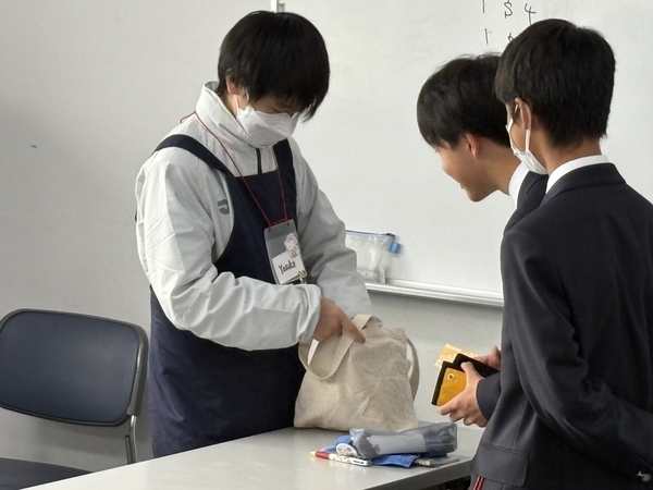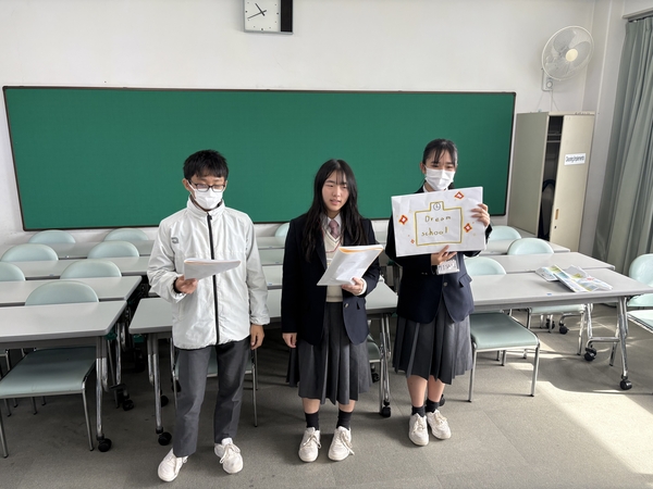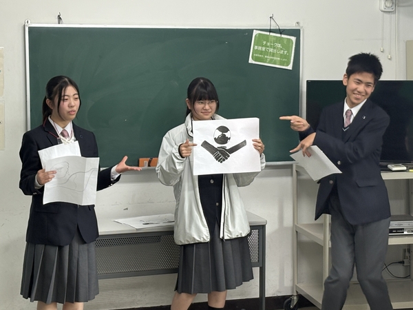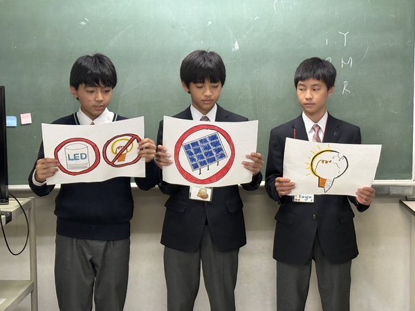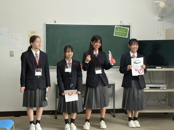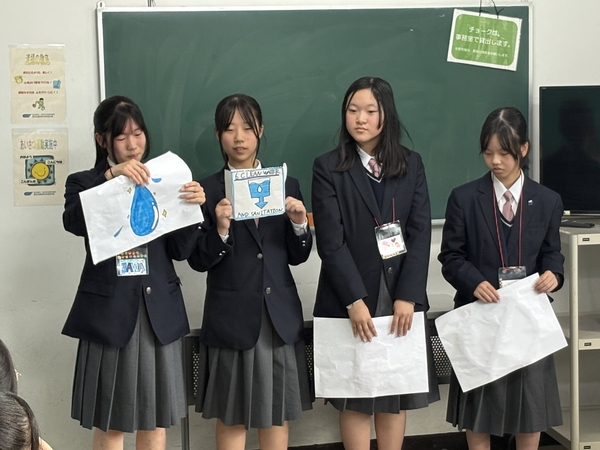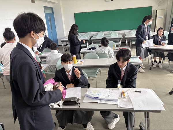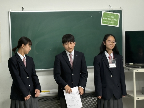 英語学習の時間では、3日間の成果を発表しました。SDGsをテーマに新しいピクトグラムを考えて発表したグループや、買い物のやり取りを英語劇で披露するグループなど、多彩な内容でした。どのグループも自信に満ちた発表を行い、これまでの努力の成果が感じられました。