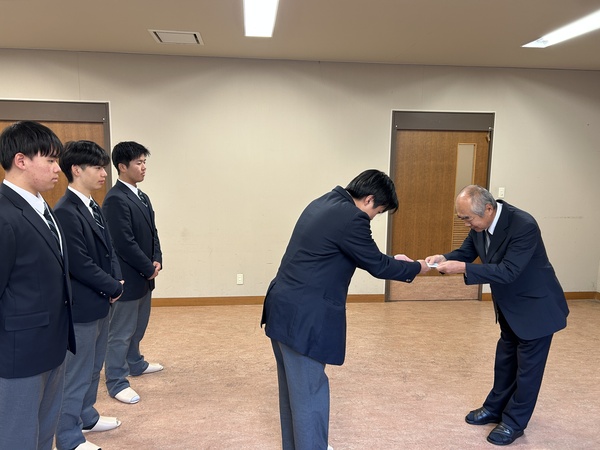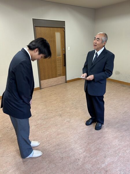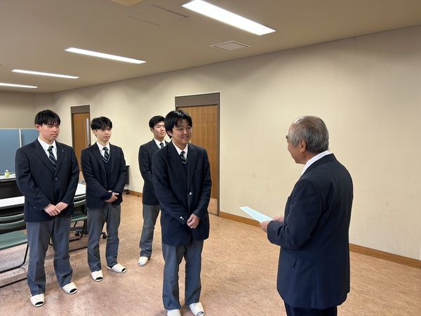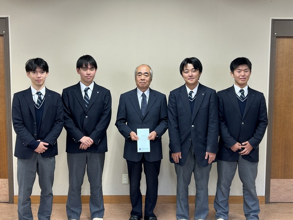 このグループは高校1年次の総合学習で「江田島の観光客増加」をテーマに探究活動を行い、江田島のオリーブを多くの人に知ってもらおうと江田島オリーブファクトリーの皆様のご協力のもと、9月の武田祭(文化祭)の模擬店で「オリーブドレッシングを使用した唐揚げ」を販売しました。そこで出た売り上げを江田島市に還元するため、この度江田島市社会福祉協議会へ売上金を寄付させていただくことにしました。当日は会長の堂野﨑様に直接お会いし、お渡しすることができました。1年間かけて進めてきた探究活動が、このような形で実を結ぶこととなり4名の生徒も満足そうな様子でした。今後も探究活動は続くので、今回の貴重な経験を活かしていきたいと思います。