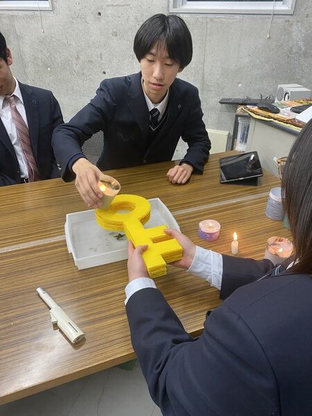 最後は恒例の「ロウソクによる未来予想」を行いました。鍵穴を通した溶けたロウを水面に落とし、冷えて固まった形から未来を占うというもので、タコや森、犬、桜など、画面越しに互いの形を言い当てながら、そこから広がる未来の話に花が咲きました。