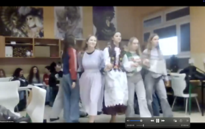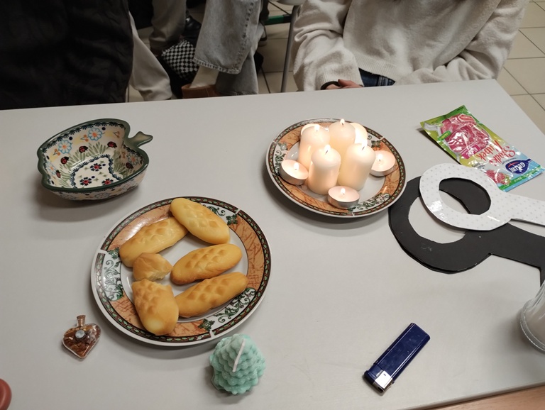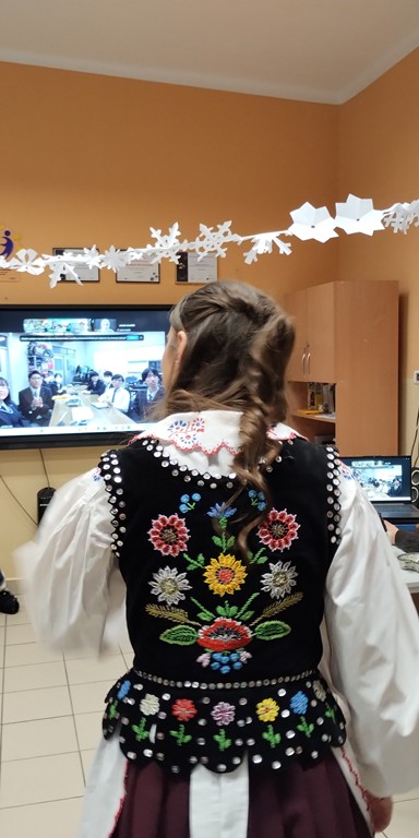 はじめに、ポーランドの高校生たちが、祝祭や特別な行事の際に踊られる伝統舞踊「ポロネーズ」を披露してくれました。卒業時に行われる舞踏会「プロム」でも踊られるそうで、二列に並び行進しながら踊る姿は大変美しく印象的でした。また、クリスマスに食べられる伝統的な食材に関するクイズも用意してくれ、クッキーのように見えるチーズは誰も正解できず、和やかな笑いに包まれました。