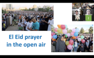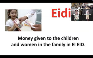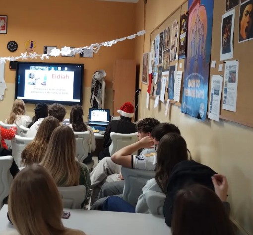 ガザ出身の3名の生徒からは、宗教的な理由によりクリスマスを祝う習慣がないことを踏まえ、イスラム教の重要な祝祭である「イード・アル=フィトル(Eid al-Fitr/断食明け大祭)」について紹介がありました。イスラム教では年に一度、約1か月間にわたり日の出から日没まで飲食を断つ断食月があり、その終了を祝うのがこの祭りです。数日間にわたり、普段会えない親戚や友人を訪ね、特別な料理やお菓子を楽しみ、新しい服を身にまとって祝う様子は、日本のクリスマスやお盆、お正月を合わせたような印象を受けました。