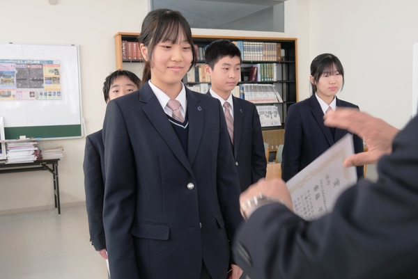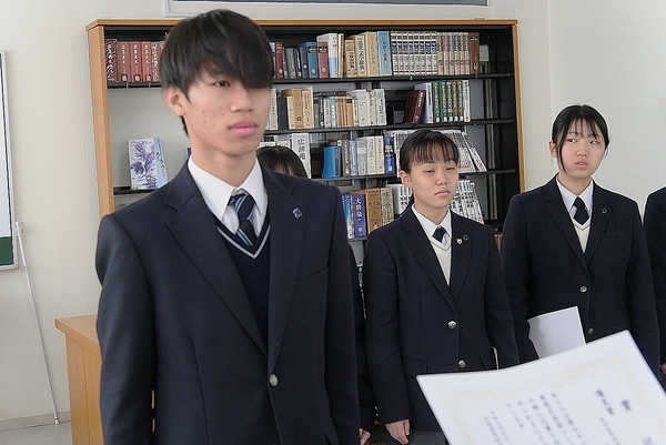2学期終業式では、生徒指導部から冬休みの過ごし方について話があった後、校長先生から式辞がありました。映画「栄光のバックホーム」で描かれた阪神タイガース横田選手について紹介された後、老子の「天網恢々疎にして漏らさず」という言葉を引用して、「老子の言葉は本来悪事についていうものだが、横田選手のように人知れぬ努力を重ね誠実に生きていくことは決して無駄にはならない。この冬休みは、自分の生き方を見つめ直す期間にして欲しい。」と話されました。