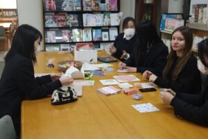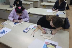 2時間目は、末永先生と美術部員のサポートによる「美術体験」を行いました。好きなアニメのキャラクターをトートバッグにデザインする活動で、フランスの高校生たちは日本のアニメにも非常に詳しく、キャラクター選びに悩む場面も見られました。しかし、デザインが決まると全員が真剣な表情で制作に取り組み、集中した雰囲気の中で創作活動を楽しんでいました。