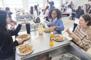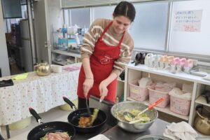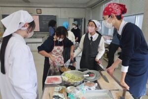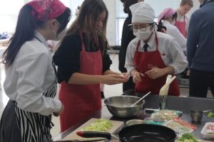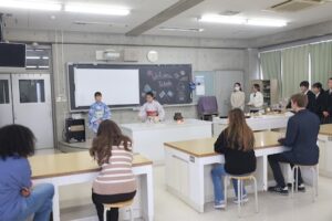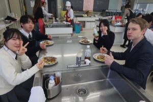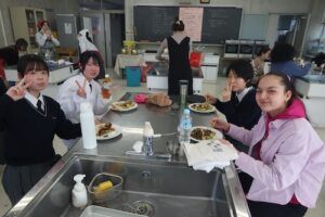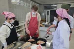 3・4時間目は、GS2年生とともにお好み焼き作りに挑戦しました。GS2年生は来月の海外研修で、現地の高校生とお好み焼きを焼く予定があり、今回はその実践的な練習の場ともなりました。どのグループも自然と会話が生まれ、協力しながら調理を進め、最終的にはどの班も美味しいお好み焼きを完成させることができました。