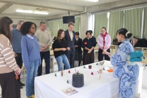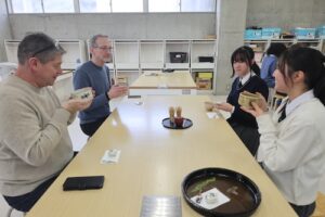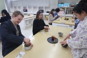 午後は、茶華道部のサポートのもと茶道体験を行いました。まずは「茶の心」についての説明を聞き、続いて部員の増田結桜さんがお点前を披露しました。その後は各自が茶筅を使って抹茶を点てる体験に挑戦しました。手首の使い方に苦労する様子も見られましたが、次第にコツをつかみ、全員が美味しいお抹茶を点てることができました。
