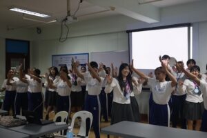 その後はフリートークの時間となりました。SOMの生徒たちはとても積極的に話しかけてくれ、最初は少し緊張していた武田の生徒たちも、次第に会話が弾むようになりました。SOMの生徒の中には日本のアニメをよく知っている生徒も多く、武田とSOMの生徒が一緒に日本のアニメのテーマソングを歌う場面もあり、交流が一気に深まりました。最後は武田、SOMの両校がダンスを披露し、最終的には一緒に踊って大変盛り上がりました。