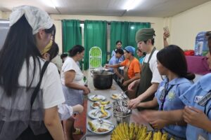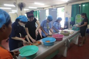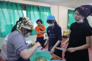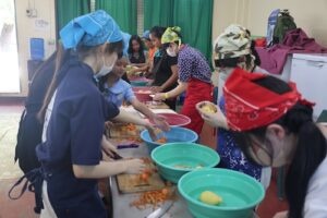 この日は全校児童1000人いるうちの低学年の生徒約250人分の食事を準備し、調理と配膳を行いました。調理場は空調設備がなく、火を使うこともあり非常に暑い環境でしたが、武田の生徒たちは積極的に動き、協力しながら一生懸命に食事作りに取り組んでいました。