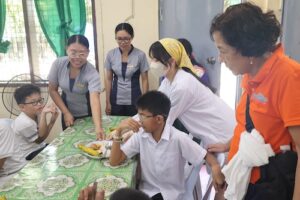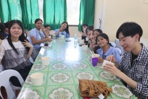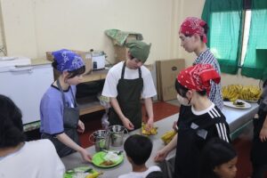食事が完成すると、子どもたちは順番に配膳を受け取り、温かい食事を楽しんでいました。外国からの訪問者に興味を持ち、テンションが高くなる場面もありましたが、全体として和やかで温かい時間となりました。生徒たちにとっても、「食」を通じた支援の意義を実感する貴重な経験となりました。