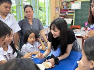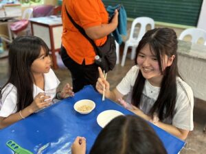 食事の準備と並行して、別のグループは教室に入り、日本文化紹介を行いました。折り紙の体験や箸の使い方の指導を通して、小学生たちと交流を深めました。これまで交流してきたSOMの生徒とはまた異なり、小学生たちはとても元気で活発で、教室は終始賑やかな雰囲気に包まれました。
