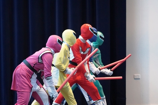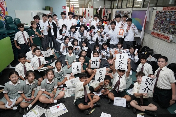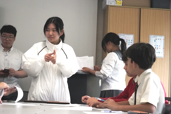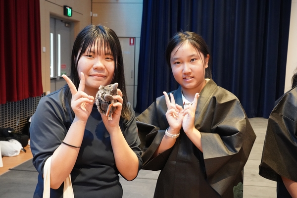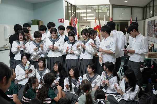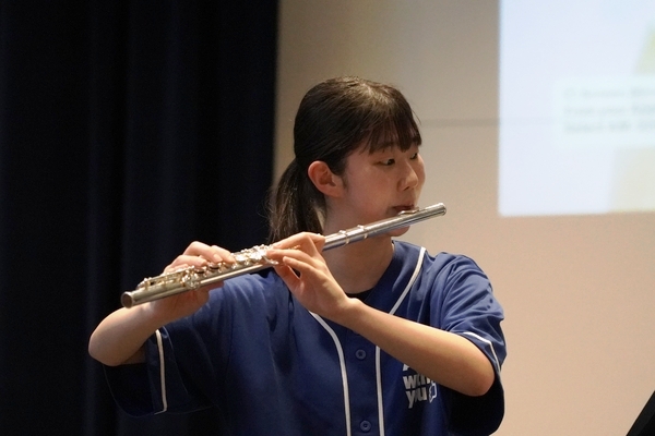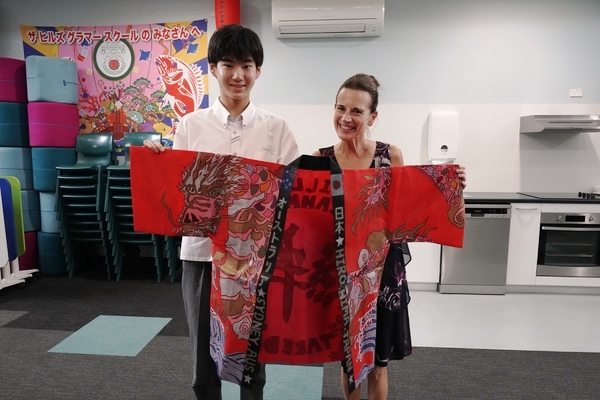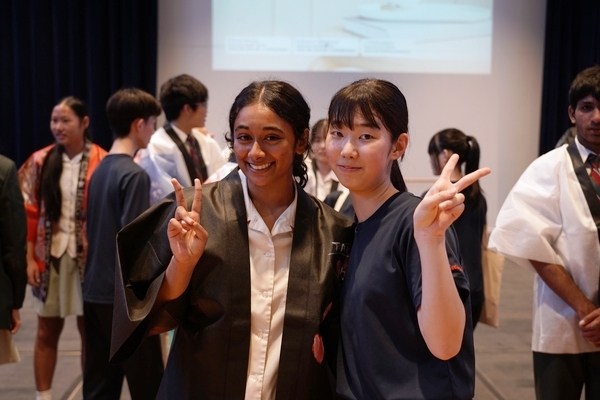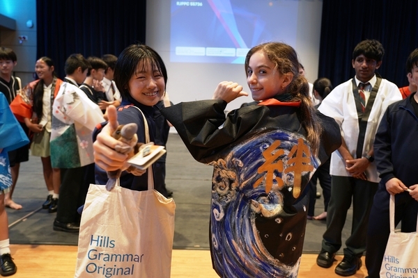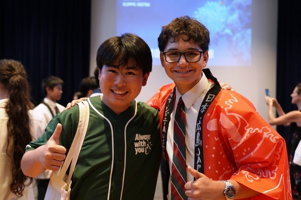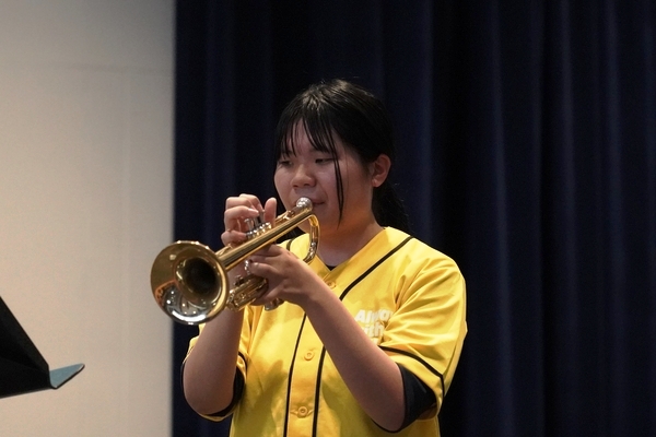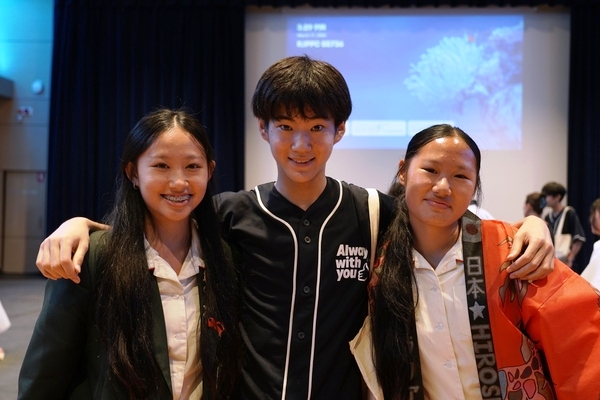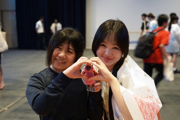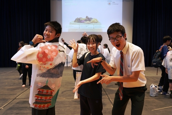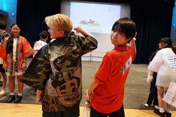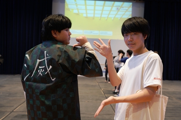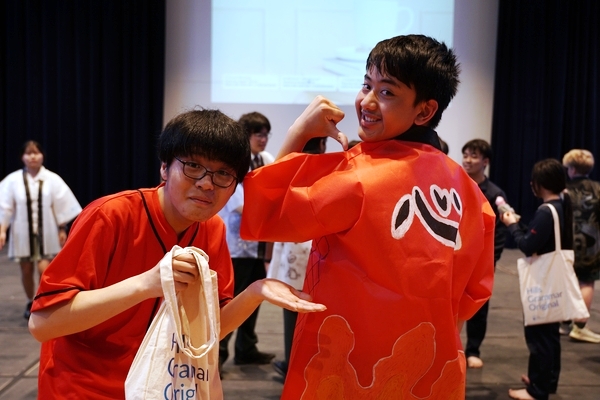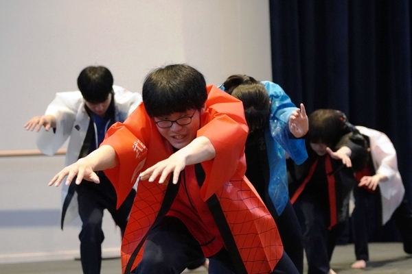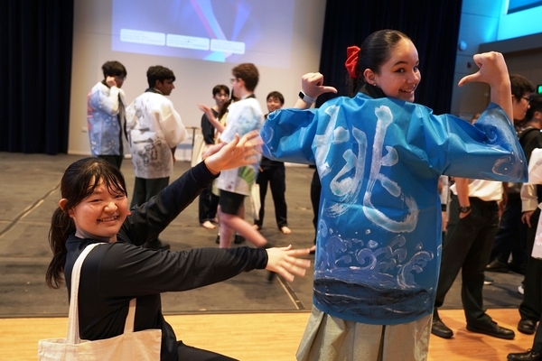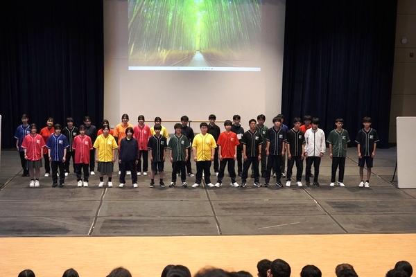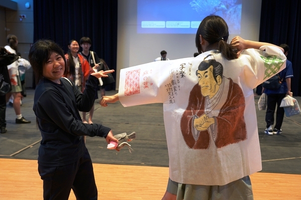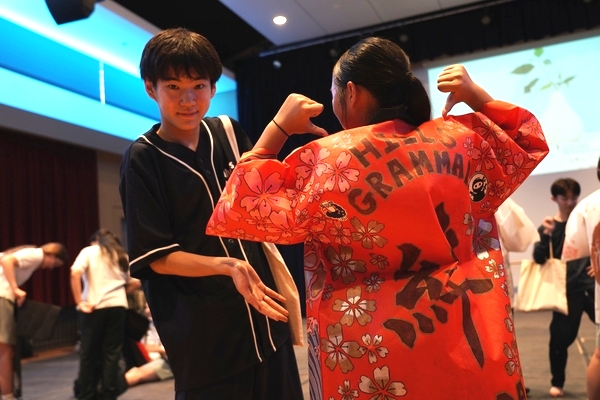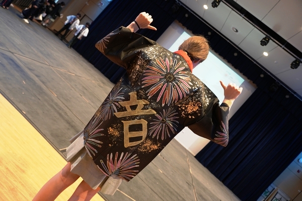 発表は、吹奏楽部によるジブリ音楽の演奏からスタート。続いて「心の瞳」の合唱、武田祭でも好評だったタケレンジャー、そしてソーラン節を披露しました。ジブリの演奏では自然と手拍子が起こり、タケレンジャーでは会場から感嘆の声と大きな声援が送られました。ソーラン節では、各自が絵を描いて装飾した法被を身にまとい、力強い掛け声とともに演舞。会場は大いに盛り上がりました。2回目の演舞ではホスト生徒も加わり、全員が笑顔で踊りました。同じデザインの法被は一つとしてなく、それぞれの法被を見比べることも楽しい時間でした。