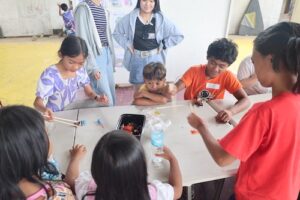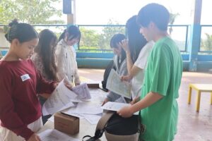 まずは、前日参加していなかった新しい高校生バディとも挨拶を交わし、本日のプロジェクトに向けた準備を行いました。今回の活動の大きなテーマは、家にも学校にも本が少なく、十分な読書習慣のない子どもたちに、村で唯一の図書室をどのように活用してもらうかということでした。前日に高校生バディと一緒に考えたアイデアをもとに、この日は実際に子どもたちを対象としたアクティビティを実施しました。
