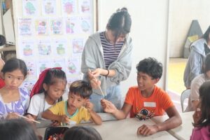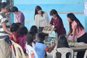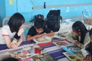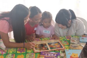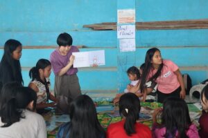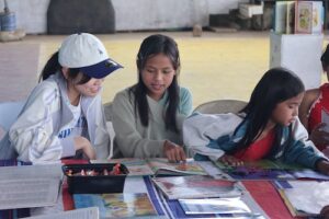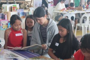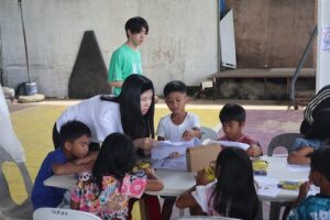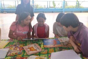 3つのグループは、それぞれ工夫を凝らしたコーナーを設けました。まず、小さな子どもたちが図書室興味を持ってもらうために、本や読書、図書室に関する「ぬり絵コーナー」、次に、比較的やさしい本を高校生と一緒に大きな声で読む「音読コーナー」、そして、少し文字数の多い本を読み聞かせる「読み聞かせコーナー」です。現地の高校生たちは、小さな子どもたちへの接し方がとても上手で、まるで幼稚園や保育園の先生のように自然に子どもたちを引き込み、活動を盛り上げていました。その姿から、武田の生徒たちも少しずつ子どもたちとの接し方を学び、読書の楽しさを伝えようと工夫しながら関わることができました。