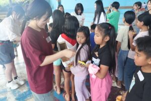前半の図書室プロジェクトに続いて、後半は武田の生徒たちが準備してきた日本文化紹介を行いました。今回は、「箸の使い方」と「折り紙」を体験してもらいました。初めて箸を使う子どもたちは最初こそ苦戦していましたが、次第にコツをつかみ、キャンディーを箸でつかんで移動させるゲームでは、驚くほど上手に使いこなす子どもたちも多く見られました。折り紙のコーナーでは、さまざまな作品を作る中で、紙でコップを折り、そこに実際に水を入れて飲めるという実用的な工夫に、子どもたちが大変驚いていたのが印象的でした。