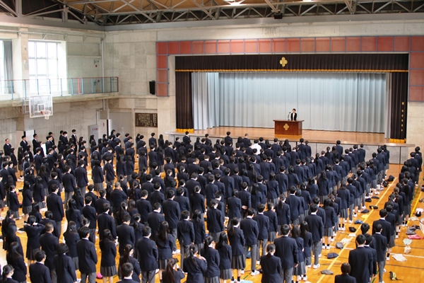 朝のSHR後、すぐに体育館に集合して留学生の紹介、着任式、そして始業式が行われました。