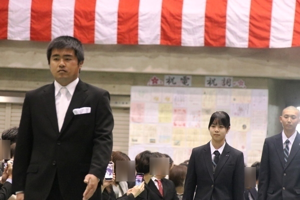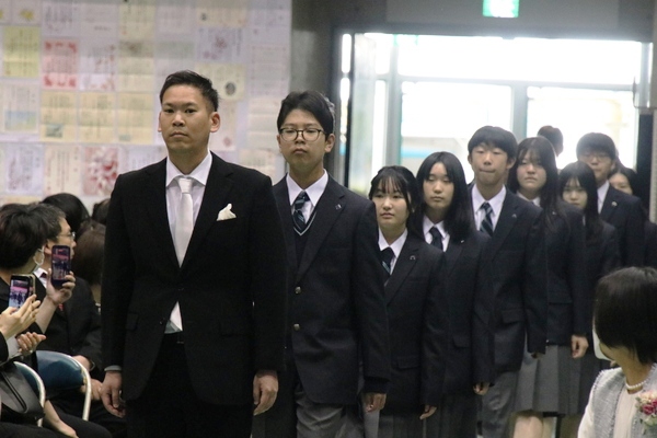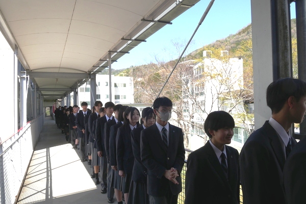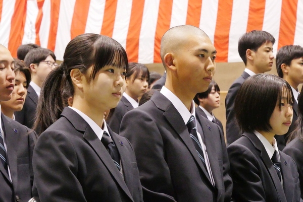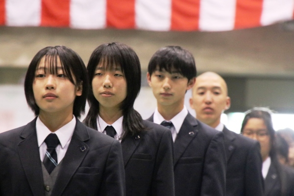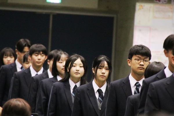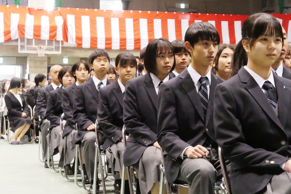 まずは掲示された名簿でクラスと出席番号を確認。クラスごとに体育館下に集合し、HR教室へと移動します。出席番号が近いクラスメートに「名前は?」「どこの学校から?」と声を掛け合う光景もさっそく見られ、これからの学校生活に期待している新入生の様子がうかがえました。