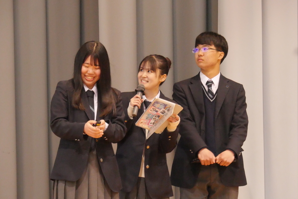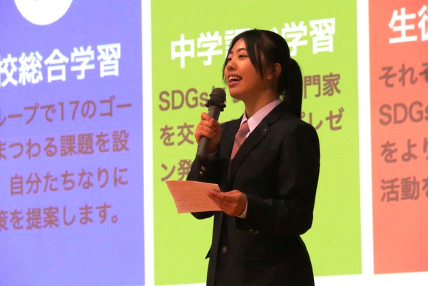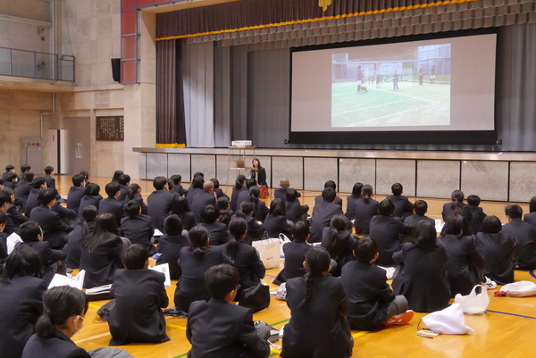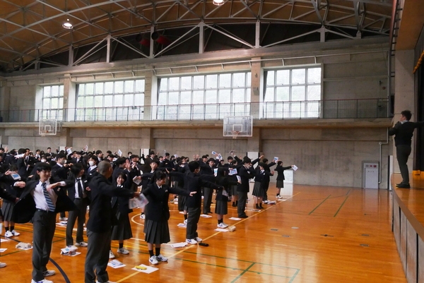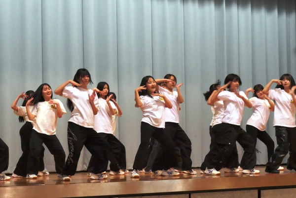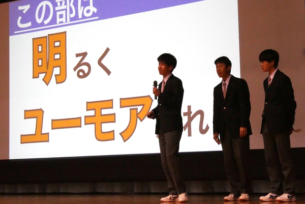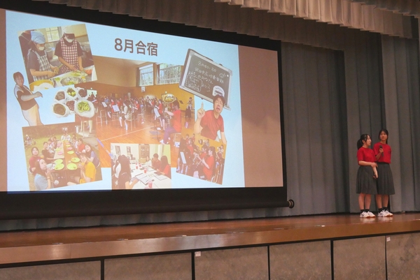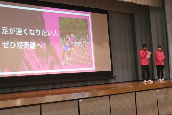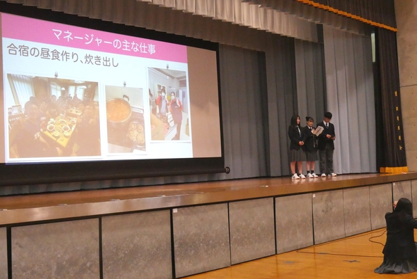 学校で取り組んでいる委員会活動やSDGsについての説明、施設紹介、そして各クラブからの部活紹介動画の披露。各説明のプレゼンも、それぞれのクラブが制作した動画も非常に手の込んだもので、なかなかの見応え・聞き応えでした。動画紹介の後は、実際にステージでプレゼンやパフォーマンスを行い入部を呼びかけるクラブの登場です!先輩たちの生き生きとした姿に「よし、入部しよう!」と思った生徒もいたはずです。本日と明日の放課後はクラブ見学会!たくさんの新入生が入部してくれることを期待しています。