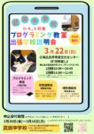 2025年度プログラミング教室&出張説明会 2026年03月22日 小学4年生・5年生を対象としたプログラミング教室です。並行して、保護者の方向けの学校説明会・個別相談会も実施します。会場は東広島市市民文化センター(サンスクエア内)です。申し込み受付は2月20日(金)17:00~を予定しています。